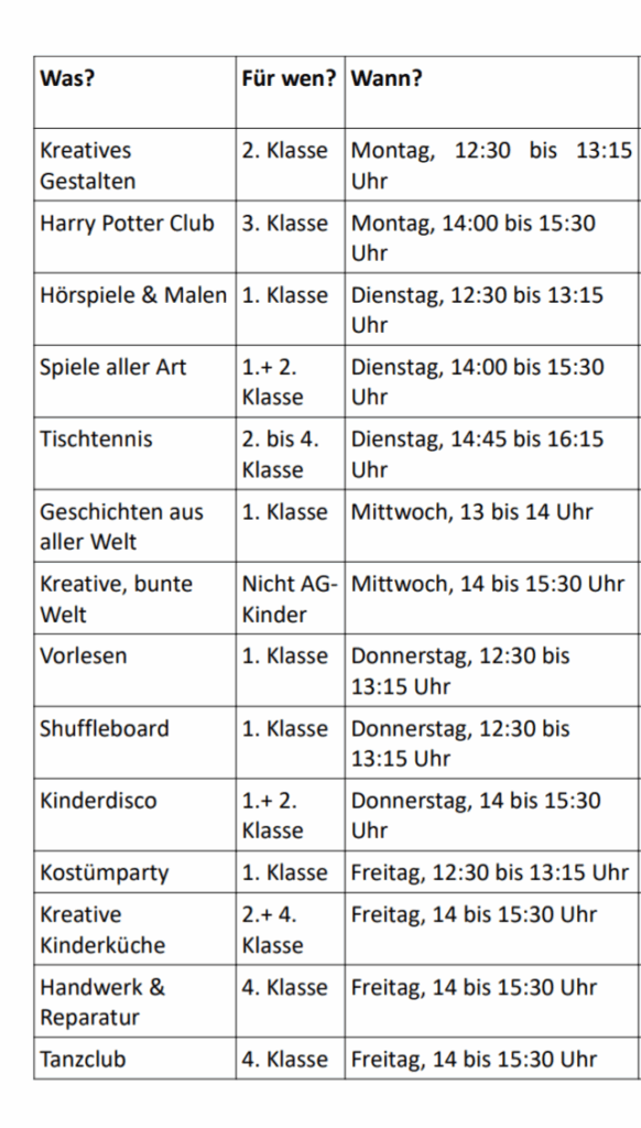 Die Kursbeschreibungen werden noch ergänzt. Sollten Sie Fragen zu den konkreten Inhalten haben dürfen Sie oder Ihre Kinder die OGS-Kräfte, die den Kurs durchführen (oder die OGS-Leitung) natürlich gerne ansprechen.