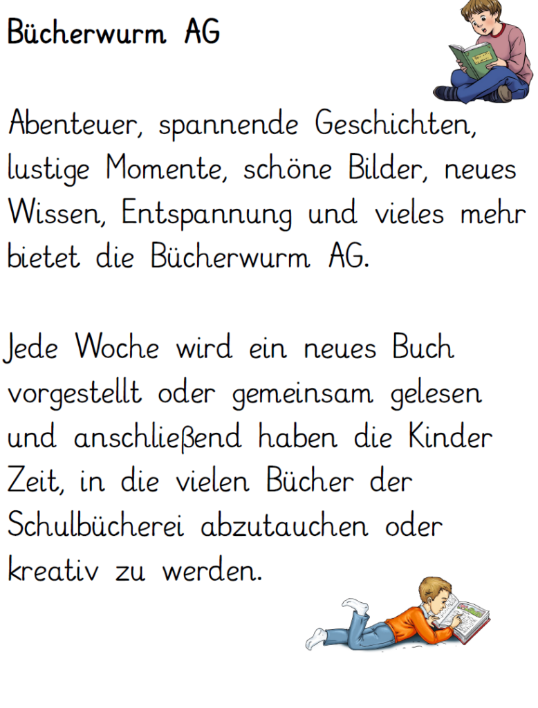 Für die Kinder des zweiten, dritten und vierten Schuljahres gibt es die Möglichkeit eine AG zu wählen. Das AG- Angebot wechselt regelmäßig.